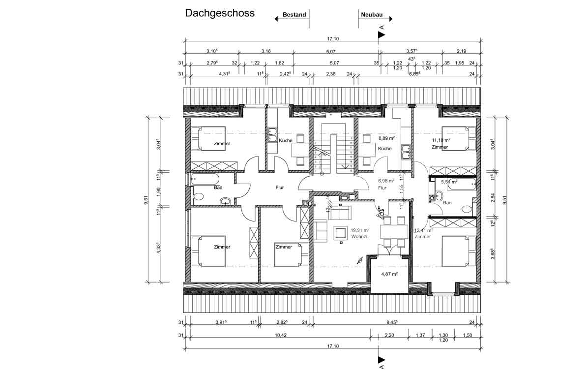 Der ergänzende Dachausbau sollte den Bedürfnissen jüngerer Menschen entsprechen und ein modernes Raumgefühl entwickeln. Durch zwei Gauben und eine Loggia wurden helle Räume geschaffen, die einen weit schweifenden Ausblick auf die umgebende Dachlandschaft zulassen und einen Austritt ermöglichen.