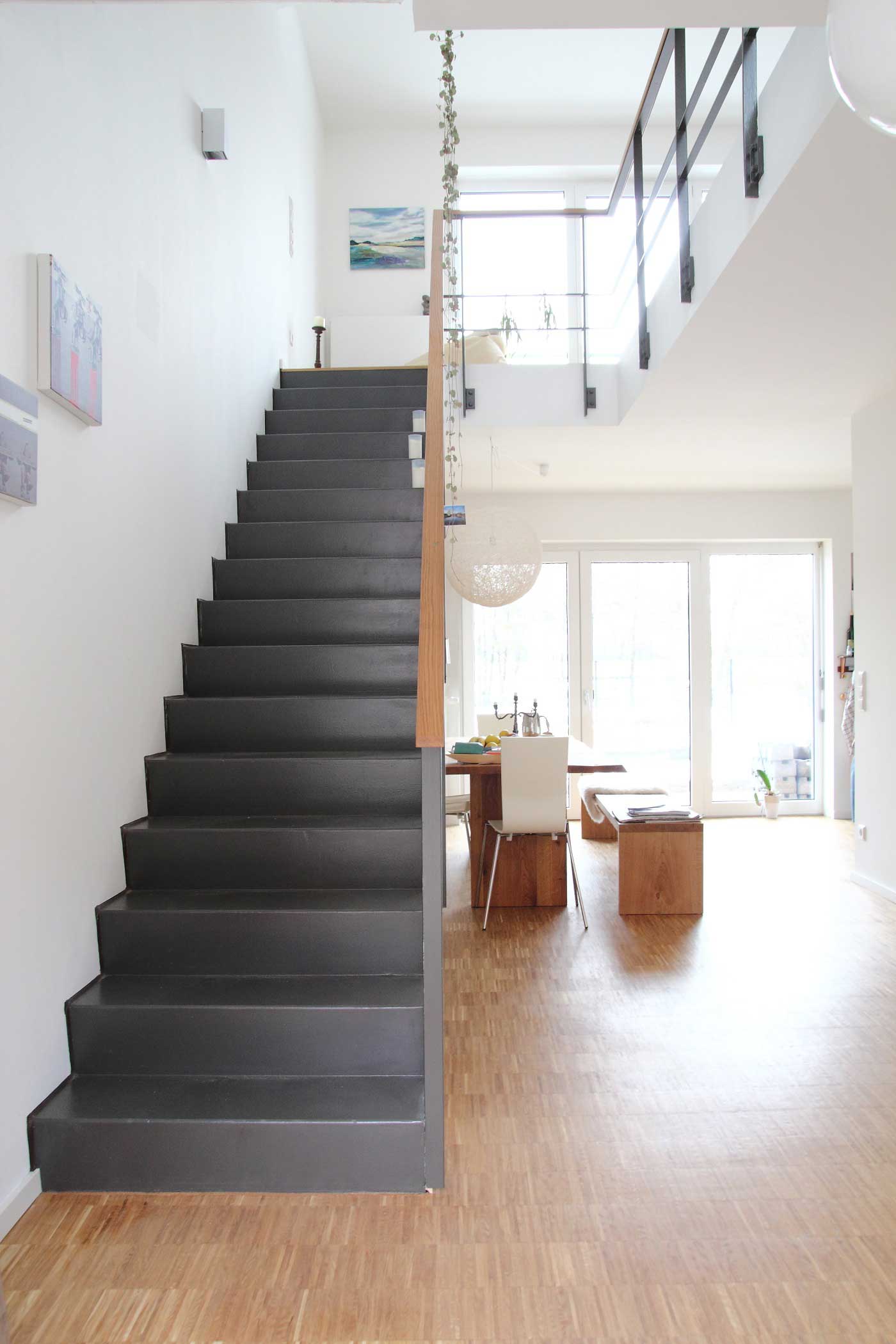 Uns war eine offene und lichtdurchflutete Wohnform wichtig. Hierfür haben wir in den ersten beiden Geschossen weitgehend auf Trennwände verzichtet. Zusätzlich haben wir durch einen Luftraum der Stahlbetontreppen eine Präsens gegeben und damit das Erdgeschoß mit dem 1. OG verbunden.